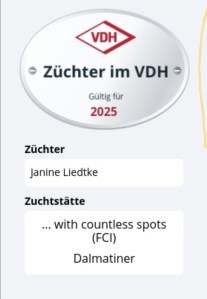 Seit 2010 bin ich eingetragener Züchter des VDH´s. In Deutschland gibt es aktuell vier Dalmatinervereine die sich durch den VDH dem Rassestandard unterwerfen.